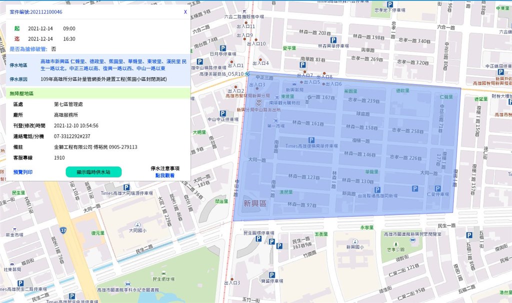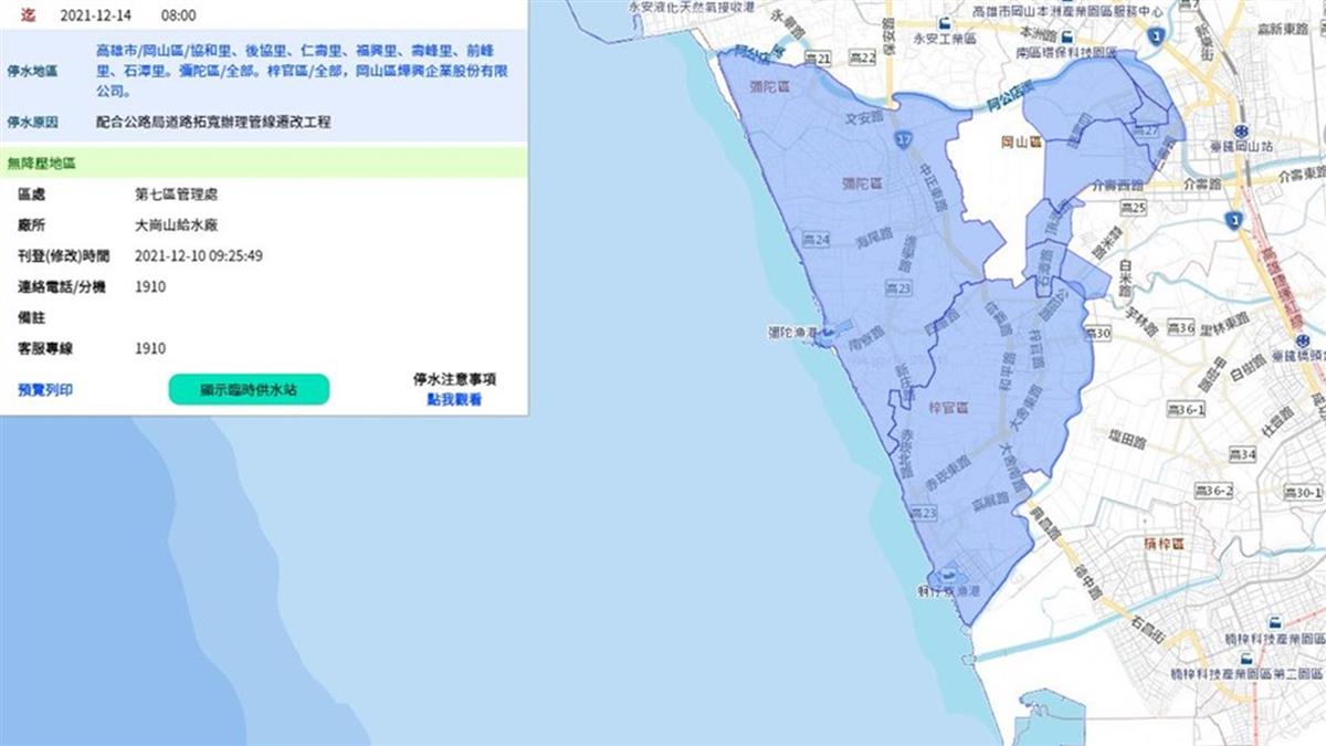 ▼台水表示,因計量管網建置工程,新興區部分里14日白天停水。(圖/翻攝自台水網頁)