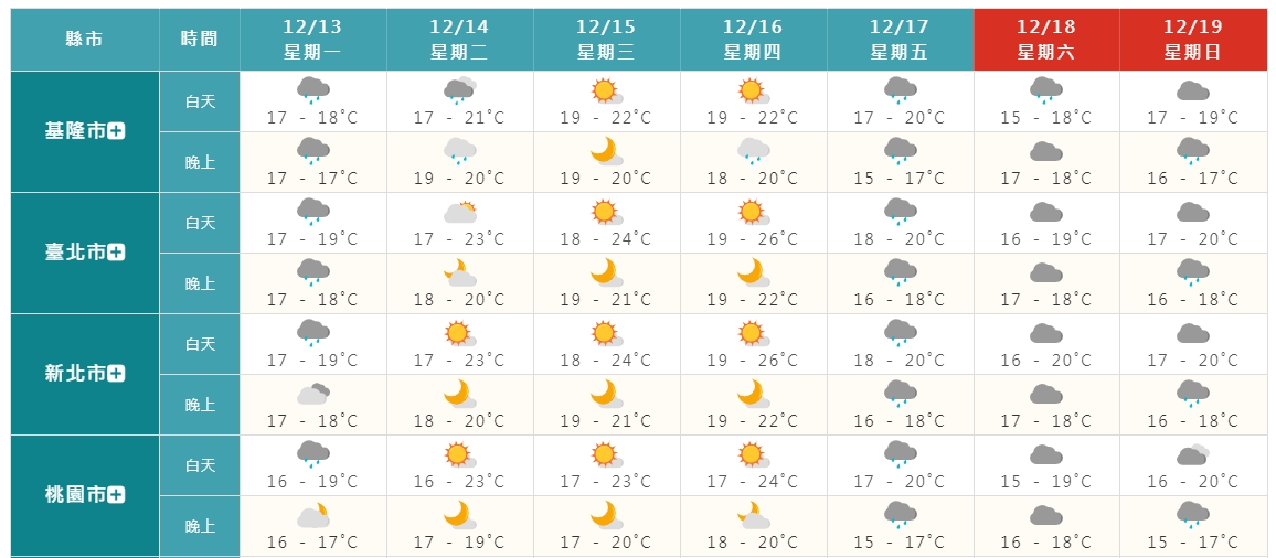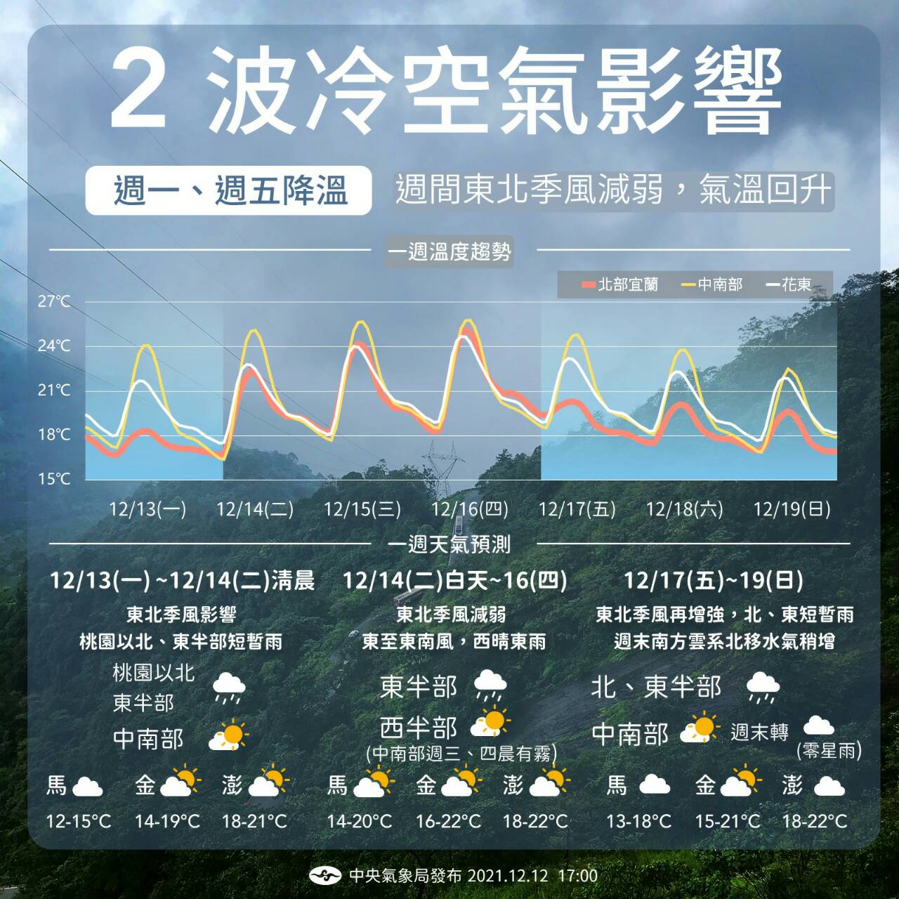林定宜說,14日白天起至16日天氣相對穩定,只有東半部地區有局部短暫雨,氣溫逐日回升,北部高溫有機會回到24、25度;下一波東北季風17日開始增強,預估持續影響至19日,北部、東北部轉有短暫雨,氣溫也會再降至與今、明兩天相似。