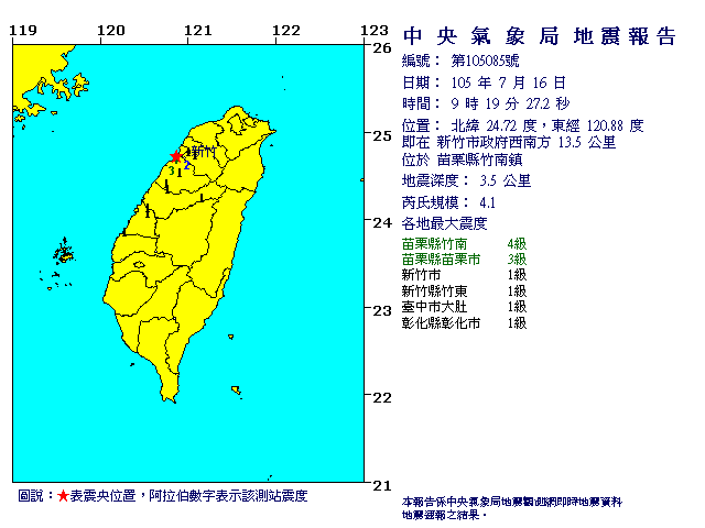 中央氣象局發布顯著有感地震最新消息,今(16)日9時19分,發生芮氏規模4.1有感地震,震央位置在新竹市政府西南方 13.5 公里 (位於苗栗縣竹南鎮),震源深度3.5公里。