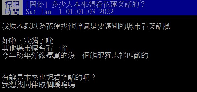 羅志祥的復出秀,網路加上現場觀看人數,瞬間超過21萬人,在網路上掀起話題。有網友在PTT以「多少人本來想看花蓮笑話的?」為題發文,驚呼羅志祥完全輾壓全台跨年晚會,原PO表示,原本以為花蓮找羅志祥,可能會讓別的縣市看笑話,「好啦,我錯了啦,其他縣市轉台看一輪,今年跨年好像還真的沒一個能跟羅志祥匹敵的!」他也好奇詢問「有誰是本來也想看笑話的啊?我想找同伴取個暖,嗚嗚……」▼鄉民狂讚羅志祥輾壓全台跨年晚會。(圖/翻攝自PTT)