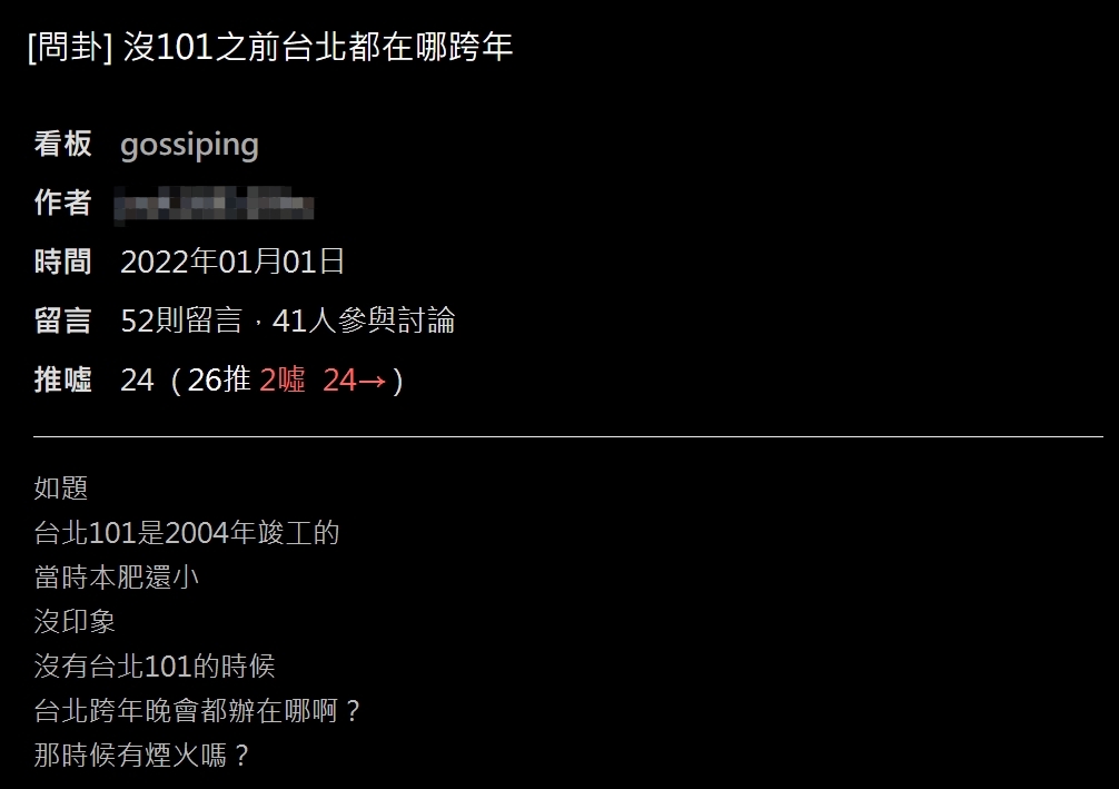 網友在PTT上發文,內容中表示「台北101是2004年竣工的,當時自己還小,沒有印象,在沒有台北101的時候,台北跨年晚會都辦在哪啊?那時候有煙火嗎?」