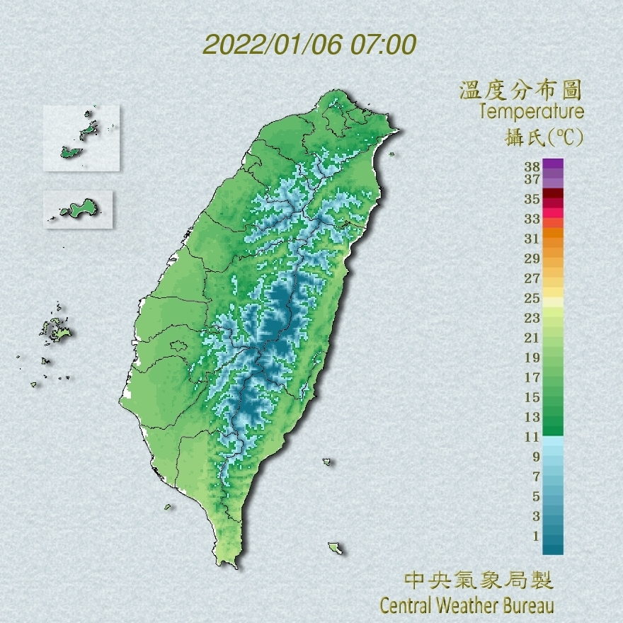 而因為台灣水氣偏多,北部及東半部地區有局部短暫雨,中南部地區為多雲偶有零星短暫雨的天氣,若溫度條件配合,3500公尺以上高山可能會有固態降水、路面結冰或降雪的機率,提醒有安排登山的朋友要特別注意;下周二至下周三隨著東北季風再增強,北台灣降雨區域稍擴大,迎風面的北部及東半部地區有些局部短暫雨,其他地區仍為多雲到晴的天氣,若溫度及水氣條件配合,在下周二左右3000公尺以上高山有降雪的機率。