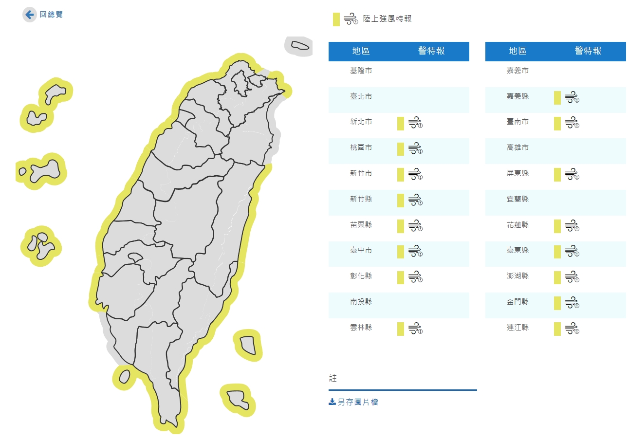▼氣象局發布陸上強風特報。(圖/翻攝自中央氣象局)