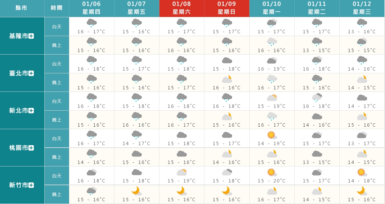 氣象局也表示這樣的天氣預估會持續到下周,下周一東北季風稍減弱,氣溫略回升,但下周二東北季風就會再增強,氣象專家彭啟明也表示目前台灣正受到東北風及南方雲系接近影響,南北及東半部都有陣雨,水氣稍多一些,會持續到周五,周末會緩和一些。而早晚較涼的天氣將持續到下周一,直到下周二、三另一波強冷空氣接近,再度降溫,不過低溫的幅度仍在調整,可能會在12至14度間,整體來說下周較這周冷一些,溫度約降2到4度。