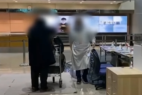 民眾:「入境的人回來這邊,要等計程車之前,要寫一些資料嗎?」入境旅客返國後如果要搭防疫車隊,有一道程序不能忽略,那就是在大廳填寫乘車資料,這名穿著藍色大衣的男子一坐下來填寫,馬上就有人員前來協助。