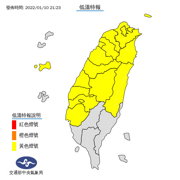 氣象局指出今日下午起,北部地區有局部10度以下氣溫,今晚起至12日清晨臺南以北及宜蘭、花蓮、金門局部地區有10度以下氣溫(黃色燈號)發生的機率。