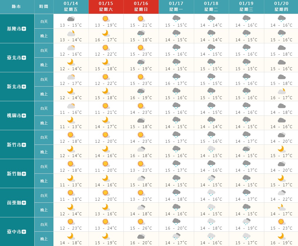 不過14日的水氣可望明顯減少,東北部、東部雲量仍較多,西半部則是多雲或晴的天氣,白天因為大部分地方預期陽光露臉,溫度上升的情況較明顯,北部和東北部高溫來到16至18度,花東地區高溫18到21度,中部高溫21到23度,南部高溫23至25度。