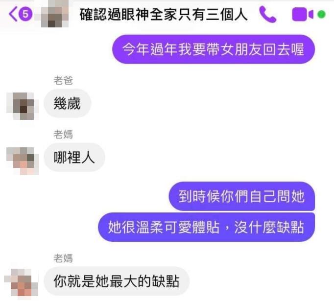 過年期間,不少人都會選擇帶另一半回家見父母。一名男網友日前就跟爸媽說,過年時將帶女友回去,得意表示女友很完美,沒有缺點,豈料媽媽竟怒嗆9字,讓兒子崩潰,逗趣對話也吸引不少網友朝聖。