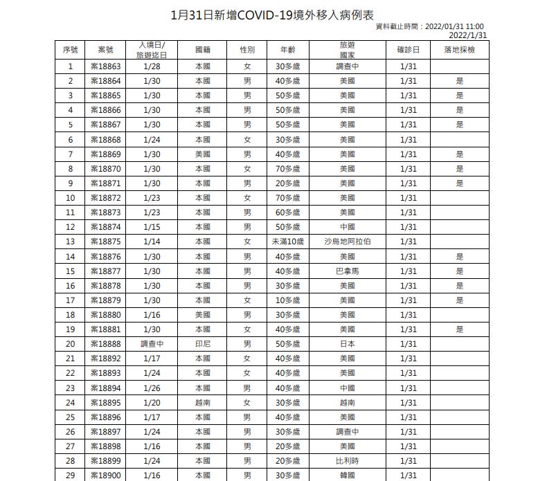 境外移入個案為26例男性、12例女性,年齡介於未滿10歲至70多歲,分別自美國(19例)、中國(2例)、厄瓜多、日本、巴拿馬、比利時、韓國、越南及沙烏地阿拉伯各1例移入;另10例調查中。入境日介於今(2022)年1月14日至1月30日;詳如新聞稿附件。