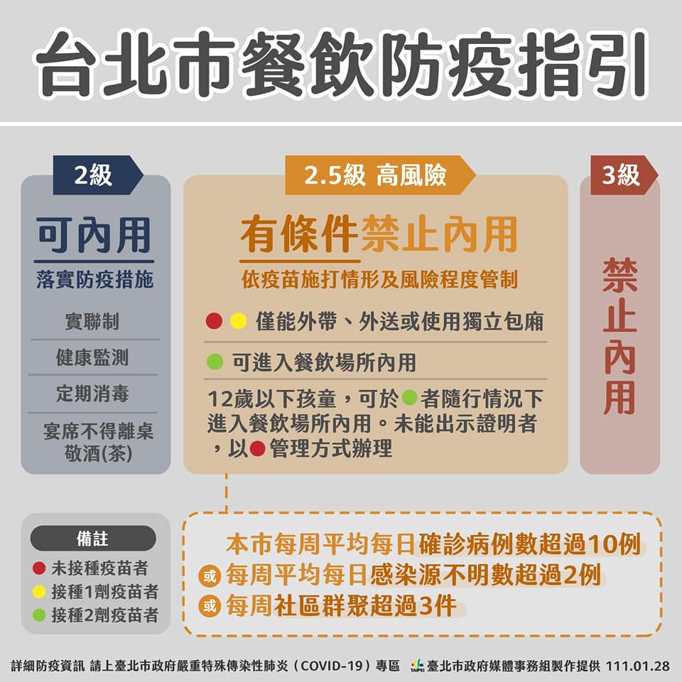 台北市副市長蔡炳坤接受媒體電訪表示,因為餐廳內用較令人擔心,觀傳局上午提出電影院禁止飲食的想法,便做成決議,明天起實施;一般餐廳則維持呼籲階段,疫苗沒打滿就建議外帶或外送。