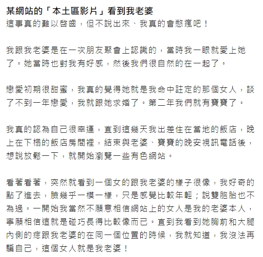 突如其來的打擊也讓原PO難以置信,「一開始我當然不願意相信網站上的女人是我的老婆本人,寧願相信這就是碰巧長得比較像而已,直到我看到她胸前和大腿內側的痣跟我老婆的在同一個位置的時候,我就知道,我沒有辦法再騙自己,這個女人就是我老婆」,隨後原PO又陸續找到了老婆的12部不雅影片,這也讓他相當絕望,甚至產生了輕生的想法,「我恨不得提起結束出差馬上衝回家,想要她給我一個解釋,不然我沒法再跟她繼續下去,我真的受不了」。