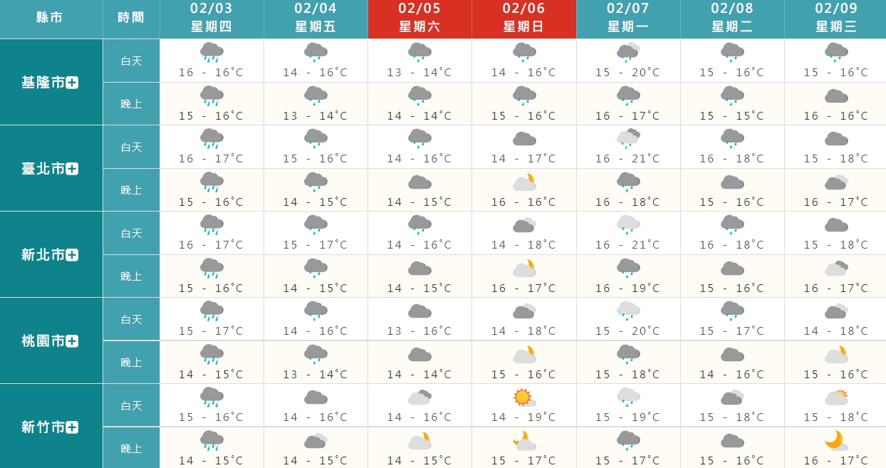 吳聖宇指出周五、周六冷空氣最強,尤其是周五晚間到周六清晨,配合輻射冷卻效應,中部、北部、東北部空曠地區溫度將再度降到10至12度間,甚至部分區域有機會低於10度以下,台北市區則有機會降到13度上下,南部、花東空曠地區低溫也會降到13至15度間,部分區域有機會降到11至13度間,氣溫會偏冷。