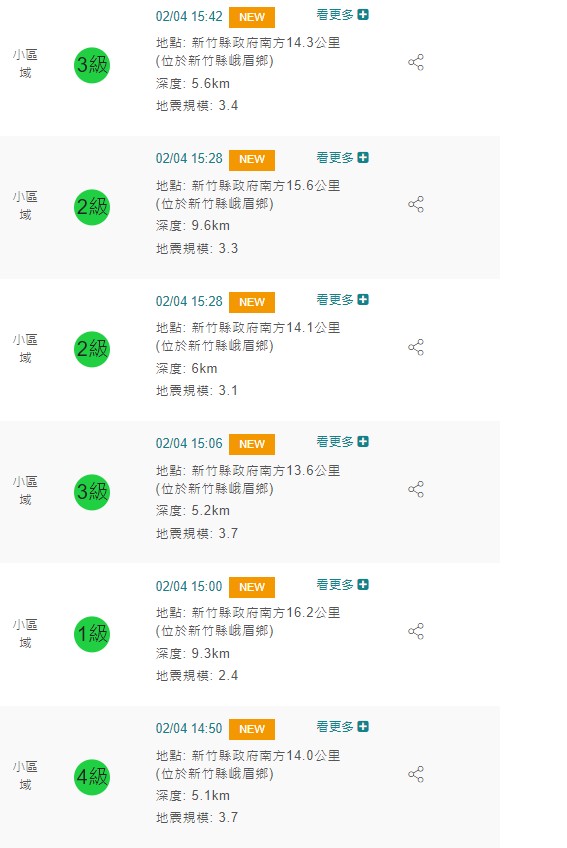 大年初四不平靜!新竹縣峨眉鄉今(4)日下午3點42分發生規模3.4地震,地震深度5.6公里。而在下午2點50分,新竹峨眉鄉同樣也發生規模3.7地震,最大震度4級,這已經是今日上午10點44分起,新竹峨眉鄉發生的第8起地震。若加上嘉義縣中埔鄉上午9點31分發生的規模3.4地震,則是今日發生的第9起地震。