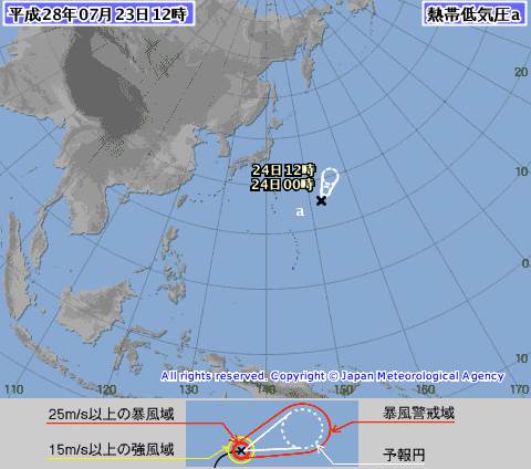 中央氣象局預報,日本東南方海面有一熱帶性低氣壓生成,目前距離台灣約3000多公里,預測會往東北移動,並有發展為輕度