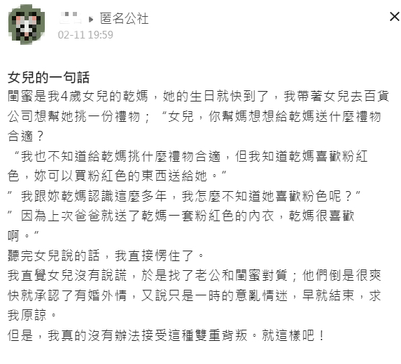 聽到此處,女網友當場愣住,依照女性的直覺,認為女兒並沒有說謊,於是找來老公與閨蜜,3人當場對質,而他們先是爽快承認婚外情,但又說是一時的意亂情迷,不倫關係早已結束,希望能獲得原諒,深受打擊的女網友則直言,「真的沒有辦法接受這種雙重背叛,就這樣吧!」