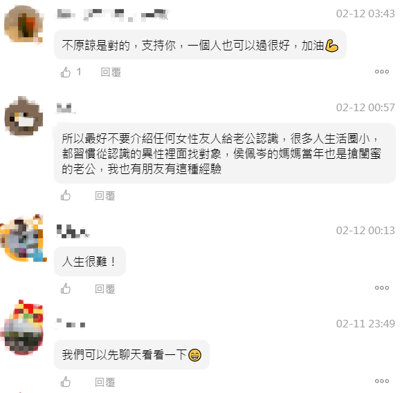 貼文一曝光,吸引不少網友關注,紛紛留言「華燈初上外傳嗎?」、「不原諒是對的,支持你,一個人也可以過很好」、「孩子是最真的,放過自己吧!」、「你也去找閨蜜的老公或男友」,還有人語重心長給出建議,千萬別介紹女性友人給伴侶認識,因為大多數人生活圈較小,習慣從認識的異性裡找對象,稍有不甚可能就會引起感情糾紛。