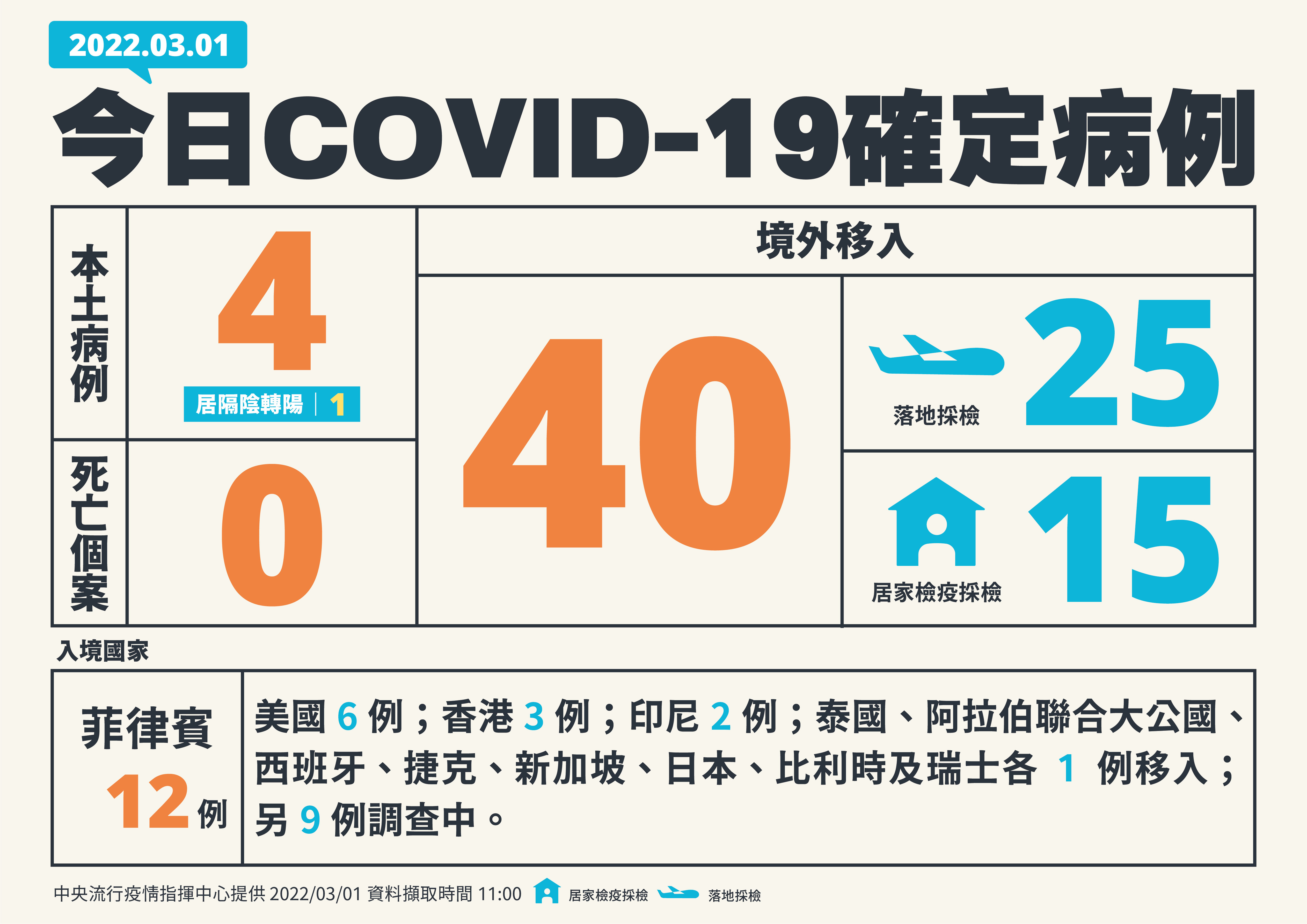 指揮中心表示,今日新增本土個案為3例男性、1例女性,年齡介於未滿10歲至40多歲;指揮中心說明,今日新增境外移入個案為23例男性、17例女性,年齡介於未滿10歲至70多歲,分別自菲律賓(12例)、美國(6例)、香港(3例)、印尼(2例)、泰國、阿拉伯聯合大公國、西班牙、捷克、新加坡、日本、比利時及瑞士(各1例)移入,另9例調查中。入境日介於今(2022)年2月5日至2月28日;詳如新聞稿附件。