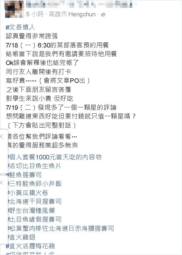 然而也就是這句「有點小貴」和「1顆星」惹火店家,店家老闆在自己的個人臉書上公開PO文痛批這名部落客,還公布「對話截圖」和他的名片,並且要大家幫忙評評理,直說服務業超無奈,而店家親友也相當夠力,接二連三的批評這位部落客「想白吃白喝」、「吃米不知道米價」、「想吃霸王餐」,還有人義憤填膺說要幫忙轉發到不公開社團「爆廢公社」。