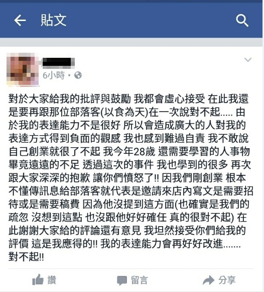 這時店家察覺網友的風向不太對,竟不是為店家發聲,因此心中的警鈴大作,20日深夜在粉絲團上發文表示,從開業以來,沒有以廣告為由,邀請部落客來品嘗美食,並說這次的事件都是溝通問題。不過這種說法,根本不是釜底抽薪,而是火上澆油,文章出現的下場就是引發更多網友批評,1顆星評論又再湧入。