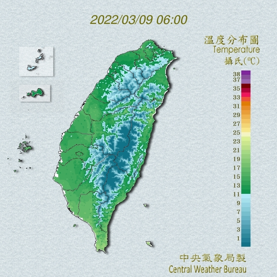 氣象局指出,今日上午受到強烈大陸冷氣團及輻射冷卻影響,各地早晚氣溫較低。新北至苗栗、基隆、雲林、花蓮及臺東有10度以下氣溫發生的機率,對此氣象局也針對9個縣市的上午發佈低溫特報。而嘉義以北及宜蘭氣溫仍會偏低,僅12至14度,臺南、高屏及花東為15至17度,感受偏冷,白天太陽出來後各地就會明顯回暖,全臺高溫預估約23至25度,但是到夜晚日夜溫差大,各地溫度約15至17度,提醒早出晚歸的朋友多添加衣物,注意保暖。