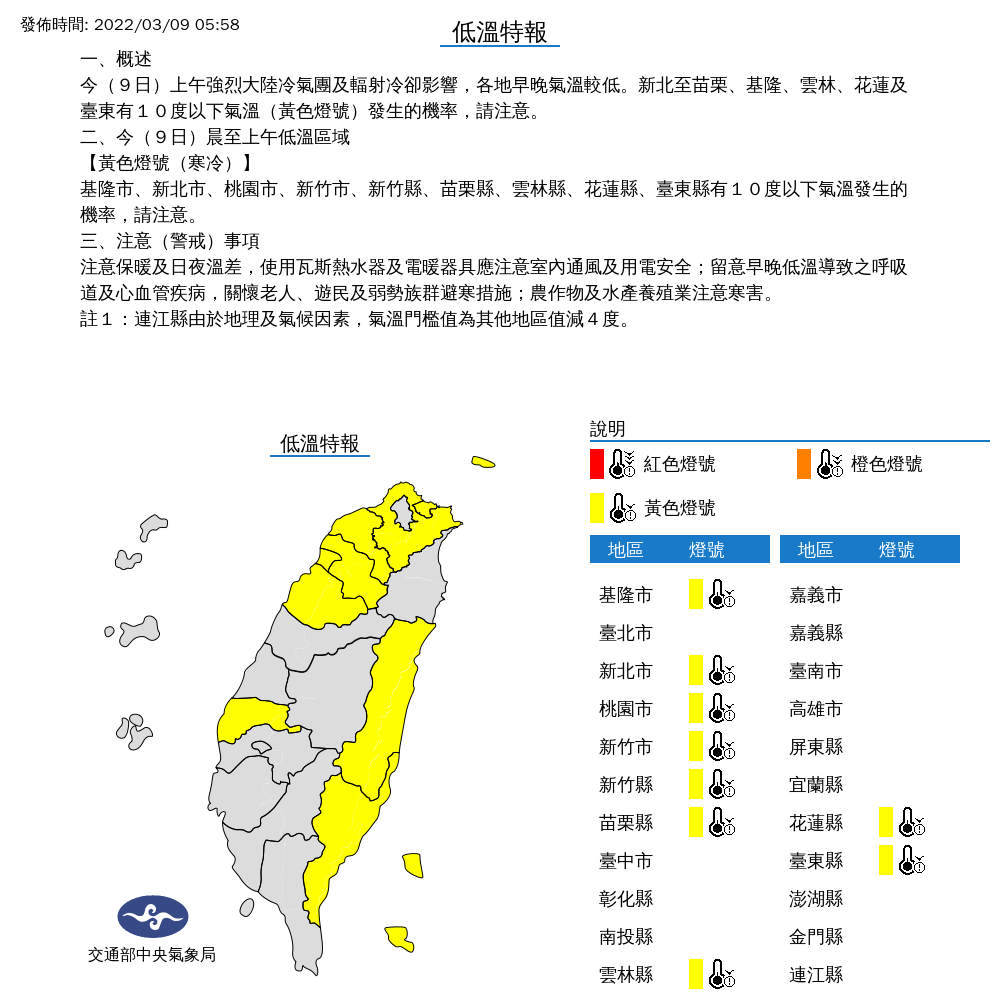 ▼氣象局針對9縣市發佈低溫特報。(圖/翻攝自中央氣象局)