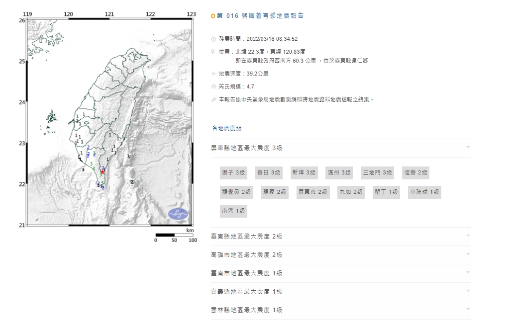 氣象局表示,今日08點34分臺東縣達仁鄉發生規模4.7有感地震,最大震度屏東縣獅子3級。