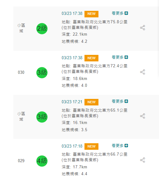 台東縣長濱鄉深19km,發生規模4.0地震,東3花3投1。隨後,在22.1 km又發生規模4.2地震,東2花2。