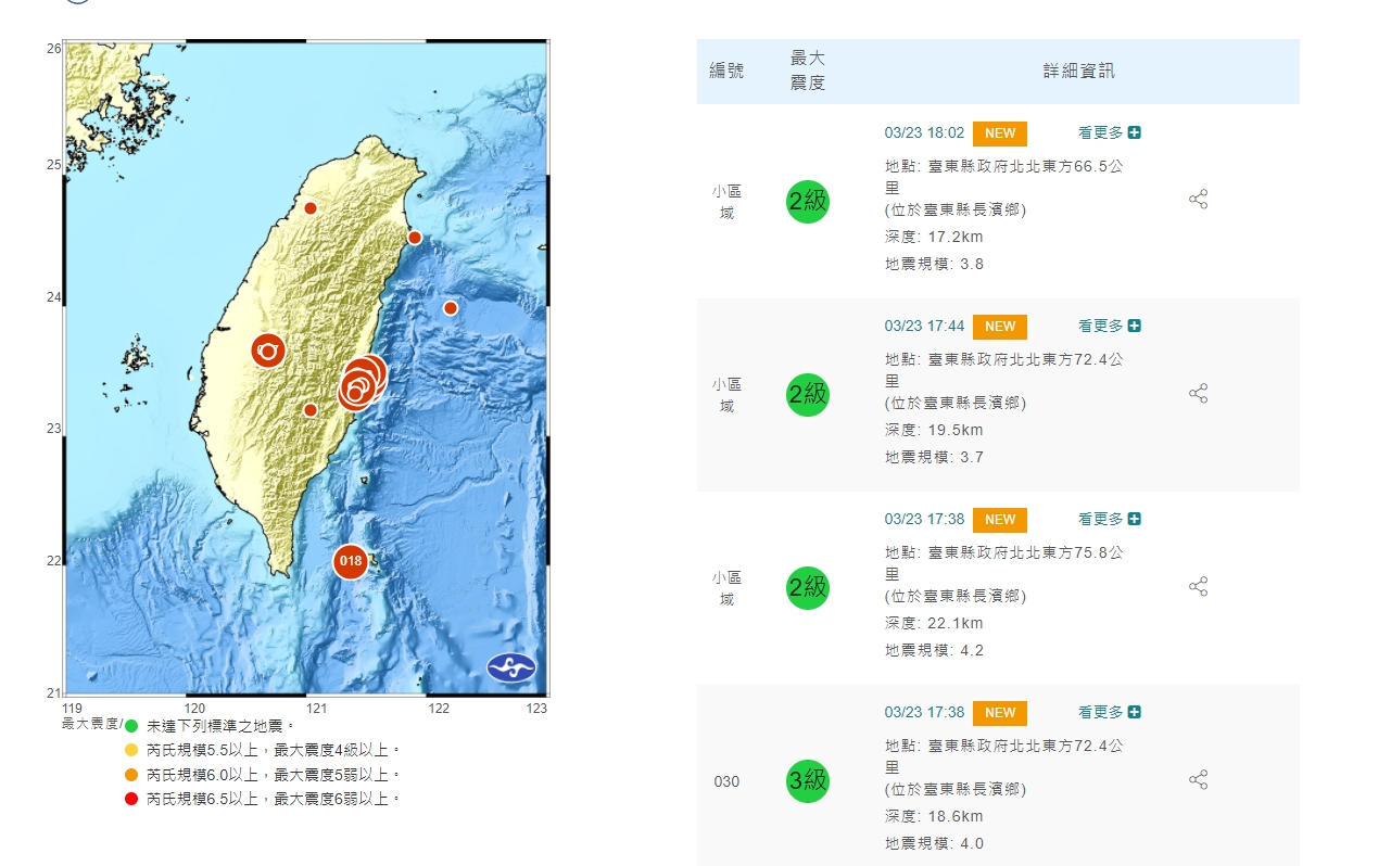 台東縣長濱鄉深17.2km,發生規模3.8地震,東2花2投1。