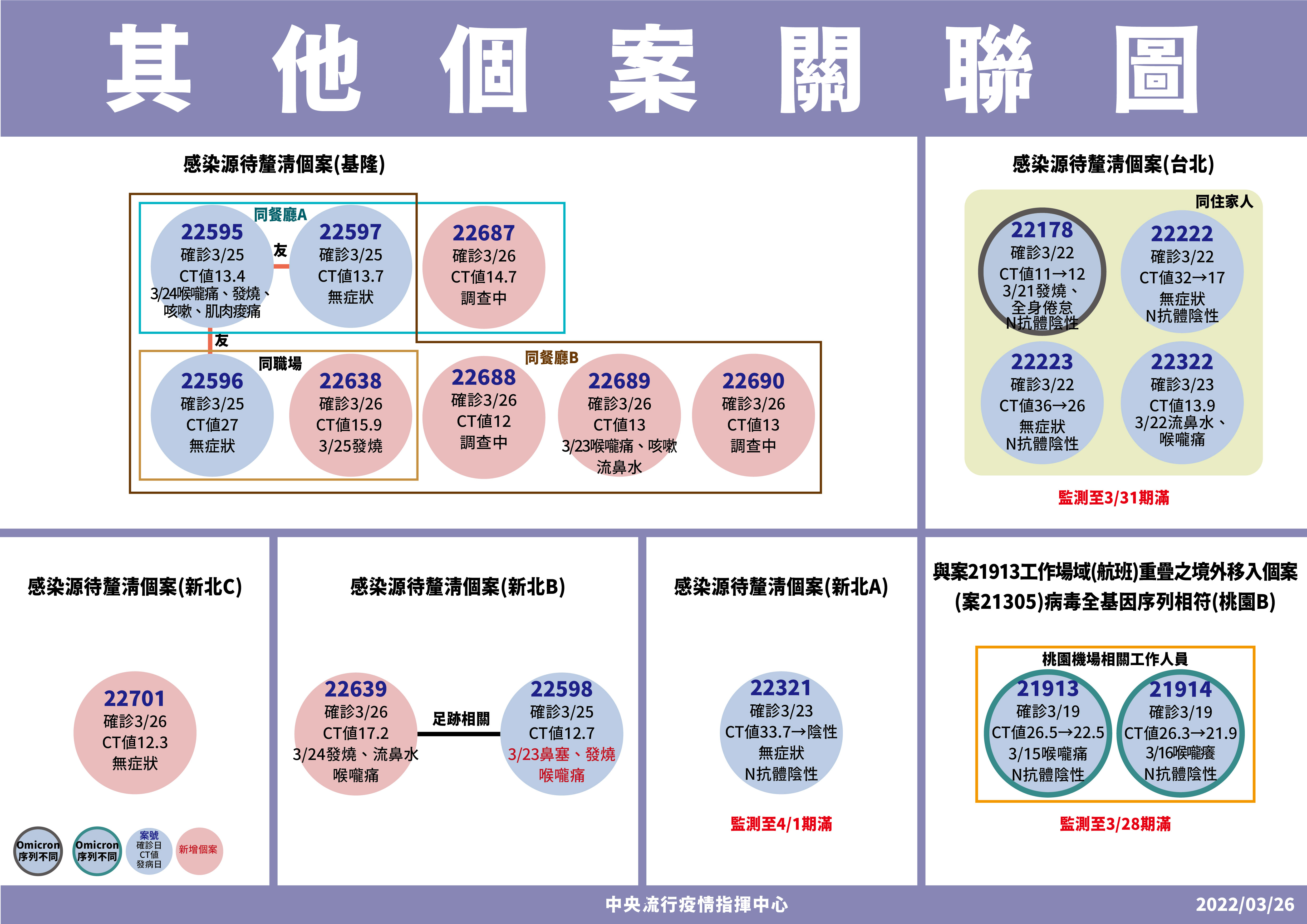 除了樹林的科技公司群聚擴大外,昨日新北中和及三重也都各新增1起不明感染源個案。中和確診者為某公司的一名男職員(案22639),他不是目前匡列的接觸者,24日時因為發燒、流鼻涕、咳嗽等症狀就醫採檢,快篩陽性確診,Ct值17.2,唯一有關聯性的,就是他和先前新北市其中一位確診者(案22598)足跡有相關。