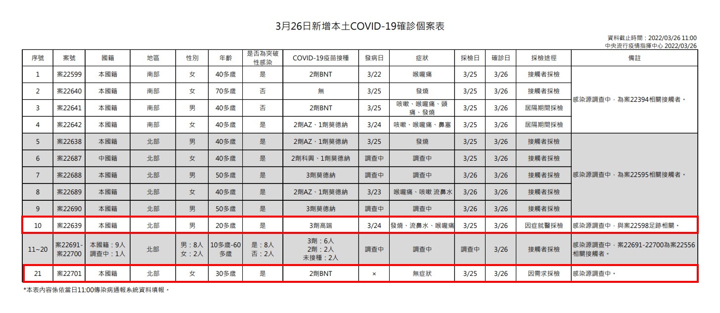 除此之外,新北市三重也有新增1例確診個案,是一名30多歲的女性業務(案22701),因陪病需求採撿陽性確診,Ct值12.3,感染源有待釐清。另外,指揮中心也指出,中和這名20多歲男職員已接種3劑高端疫苗;三重30多歲女職員則接種2劑BNT疫苗,且無症狀感染,後續都還需要進行詳細疫調,以釐清感染源。