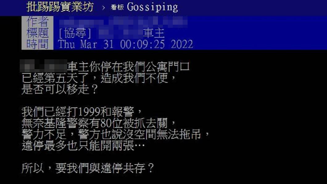 「車主你停在我們公寓門口,已經第五天了,造成我們不便,是否可以移走?」原PO在PTT發文抱怨,一輛白色轎車從五天前便停在自家門口,雖然自己有打1999也已報警,卻沒什麼效用,「基隆警察有80位被抓去關,警力不足,警方也說沒空間無法拖吊,違停最多也只能開兩張…所以,要我們與違停共存?」