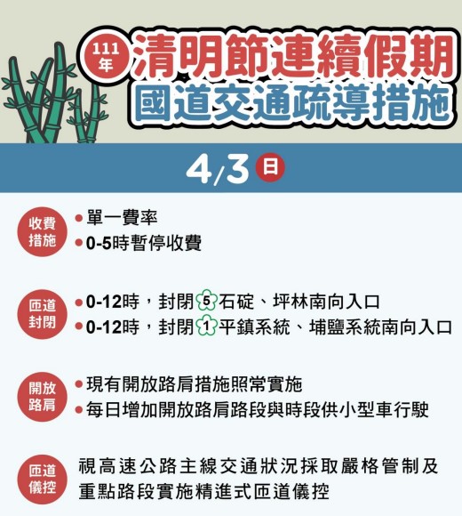 相關疏導措施包括0-12時封閉國1平鎮系統及埔鹽系統與國5石碇及坪林南向入口、單一費率、0-5時暫停收費、開放路肩、匝道儀控等。高公局呼籲,民眾出門務必養足精神,避免疲勞駕駛,行車注意車前狀況,保持安全距離並小心駕駛。