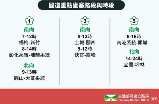 建議西部國道南向用路人儘量於6時前或12時後出發,國5南向用路人建議5時前或17時後出發,另國5北向用路人建議於9時前出發,節省寶貴時間。