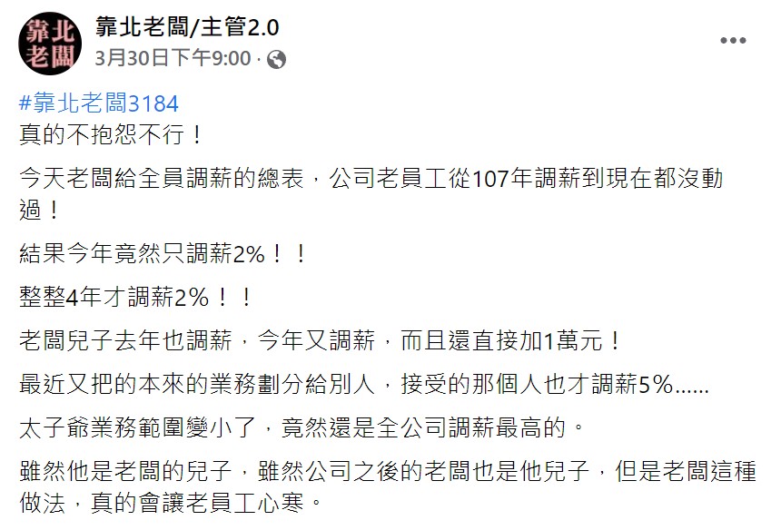 但更讓原PO無言的是,老闆的兒子不但連續2年都調薪,薪水更直接加1萬元,最近又把本來的業務劃分給別人,但對方也才調薪5%,原PO無奈感嘆,「太子爺業務範圍變小了,竟然還是全公司調薪最高的」,認為雖然對方是老闆的兒子,且將來也要掌管公司,成為自己的老闆,但是老闆祭出這種差別待遇,讓原PO看不下去,忍不住直呼「真的會讓老員工心寒。」決定將這件事情PO網,舒緩自己的心情。