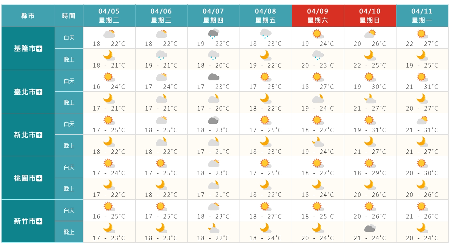 氣象局表示,明天(5日)各地大多為多雲到晴,只有東半部地區有零星短暫雨,午後西半部山區有零星短暫陣雨的機率;氣溫方面,北部、東半部高溫約24、25度,中南部高溫約27、28度,中部以北低溫約15、16度,其他地區低溫17至19度,西半部地區日夜溫差較大。