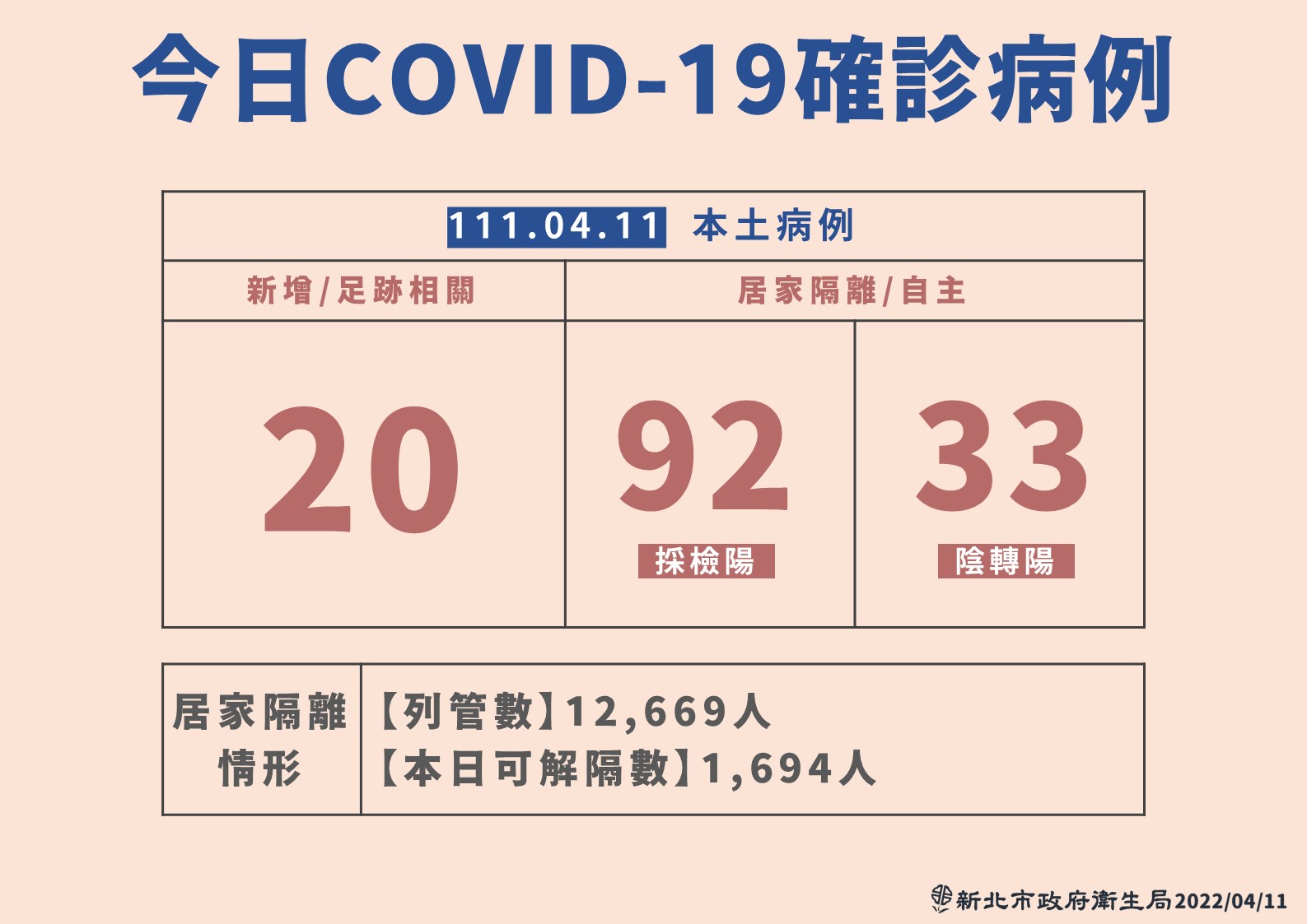 新北市衛生局表示,今天新增的145例,其中有20例新增足跡相關採檢陽性、92例居隔採檢陽性、33例居隔陰轉陽,居住地為新北。而這其中外縣市相關案共59人:基隆相關案4人、北市相關案40人、桃園相關案9人、宜蘭相關案1人、花蓮相關案2人、金門相關案3人。
