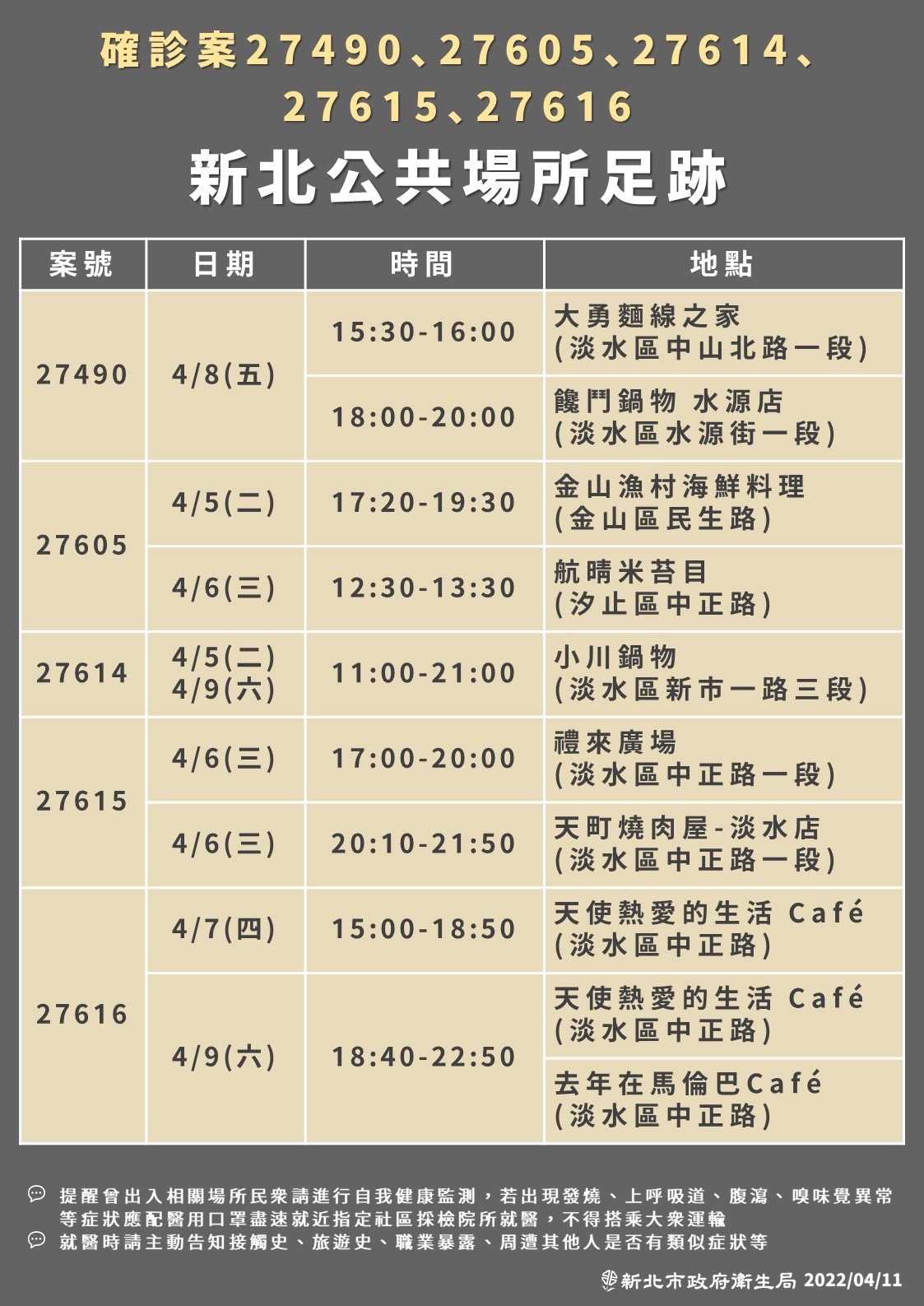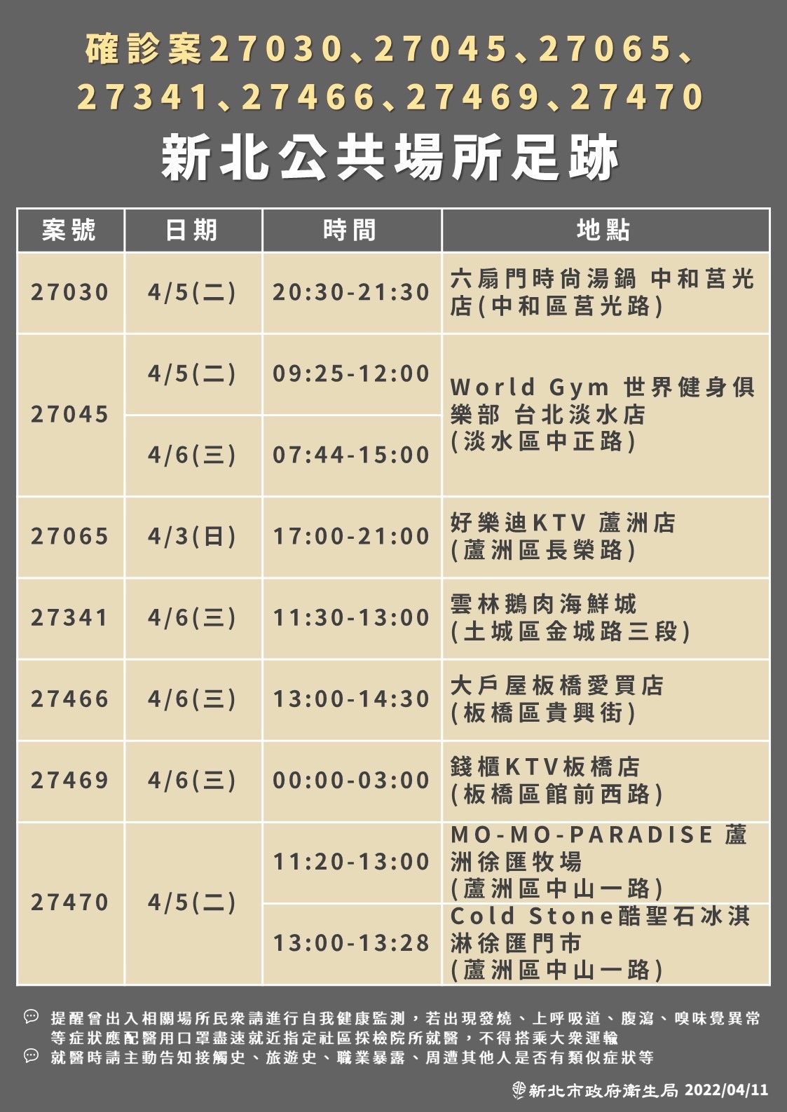 另外,新北市衛生局也提醒,曾經出入相關場所的民眾,請自主健康管理,如果出現疑似症狀,應確實佩戴醫用口罩,儘速就醫。