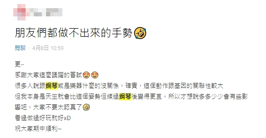 另外,也有不少網友表示這個手勢能否做出來,跟學鋼琴或是樂器並沒關係,對此原PO也在貼文補充解釋,「確實,這個動作跟基因的關聯性較大,我本身是天生就會比這個姿勢,但練過鋼琴後變得更直(手指),所以才想說多多少少會有些影響吧」原PO也希望大家看過做過好玩就好,不要太過認真。