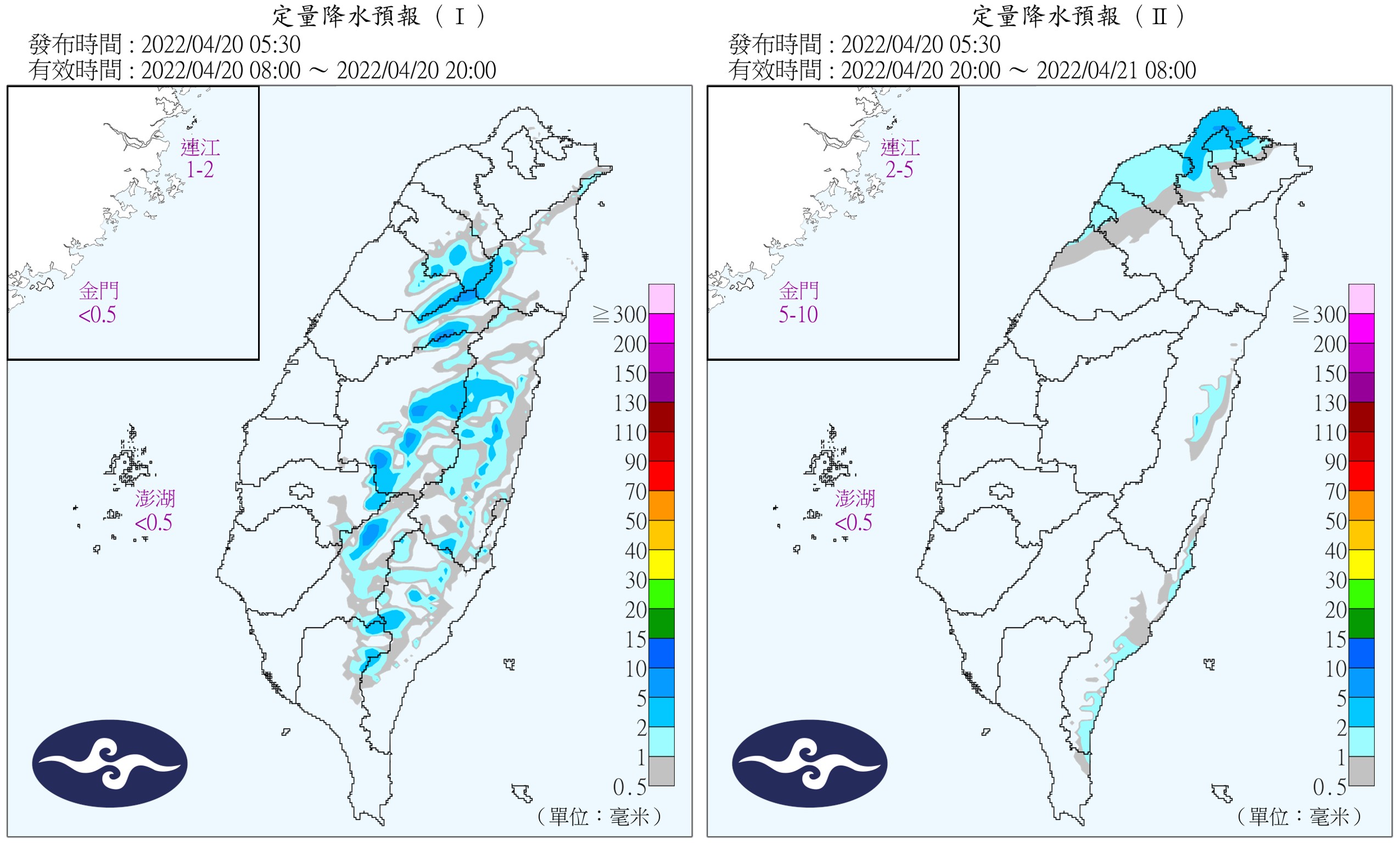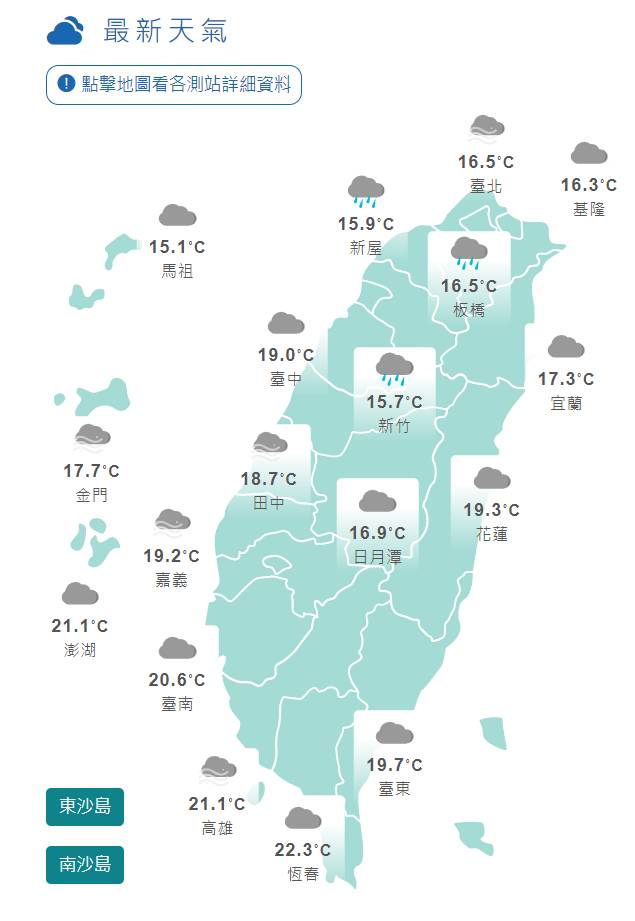 中央氣象局預報員陳伊秀接受《EBC東森新聞》採訪時說明,今日清晨各地都呈現涼意,基隆七堵測到13.5度的低溫,也有零星雨勢,不過降雨情形將在白天之後逐漸趨緩,陳伊秀指出,明(21)日清晨將有一道微弱鋒面掠過台灣北部海面,北部、東半部地區會出現局部雨勢,中午過後中南部山區有零星陣雨,簡單來說今明兩日的天氣型態相當接近。