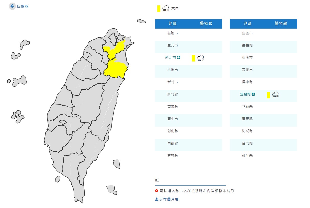 氣象局並發布大雨特報,午後對流雲系發展旺盛,易有短延時強降雨,今天宜蘭及新北山區可能有局部大雨發生,注意雷擊、強陣風及溪水暴漲。大雨特報地區為新北市、宜蘭縣。