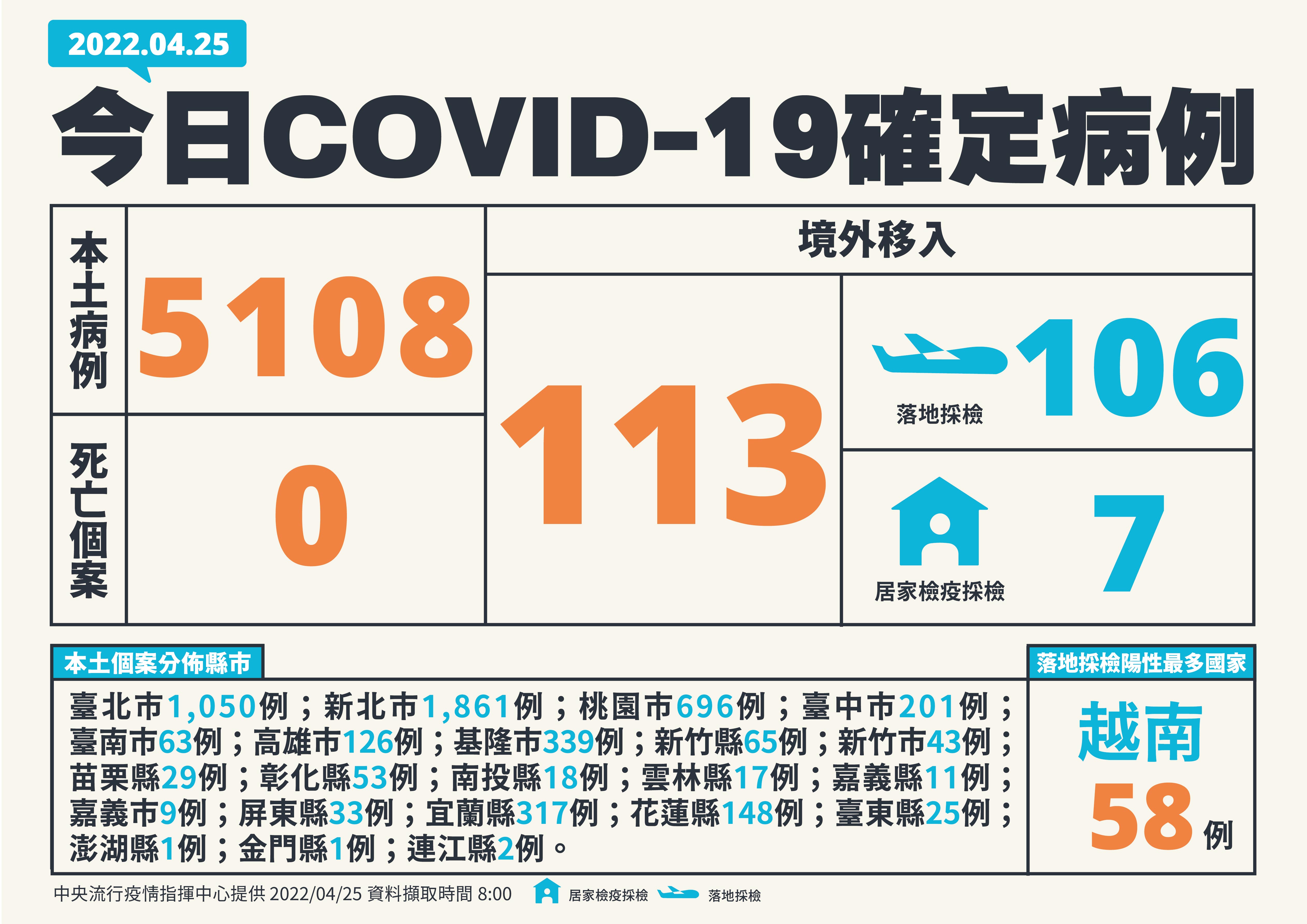 指揮中心表示,今日新增之5,108例本土病例,為2,488例男性、2,588例女性、32例調查中,年齡介於未滿5歲至90歲以上,發病日介於今(2022)年3月28日至4月24日,其中包含2,982例為無症狀感染。個案分佈為新北市(1,861例),臺北市(1,050例),桃園市(696例),基隆市(339例),宜蘭縣(317例),臺中市(201例),花蓮縣(148例),高雄市(126例),新竹縣(65例),臺南市(63例),彰化縣(53例),新竹市(43例),屏東縣(33例),苗栗縣(29例),臺東縣(25例),南投縣(18例),雲林縣(17例),嘉義縣(11例),嘉義市(9例),連江縣(2例),金門縣及澎湖縣(各1例)。相關疫情調查持續進行中。