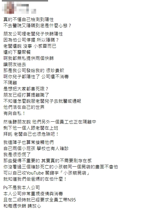 有女網友在臉書社團《爆怨2公社》指稱,友人的公司老闆兒子快篩陽性,老闆擔心公司營運會停擺,於是選擇隱瞞兒子確診,甚至謊稱只是小感冒,還約下屬聚餐,讓原PO氣得大罵友人老闆自私「啊你兒子都陽性了,公司還不消毒、不隔離,是想把大家都害死哦?」
