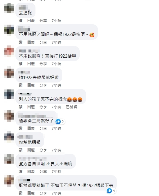另外,也有網友都建議原PO可以打1922,直接向相關單位檢舉「通報1922啊!順便罰他隱匿確診者罰金」、「請朋友幫他們通報」、「打1922匿名通報啊」、「依傳染病防治法開罰那些人才會怕吧」、「直接檢舉啊!迫害員工」、「通報+1」。