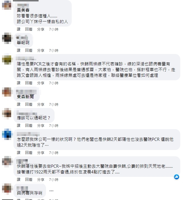 貼文發布後,短短不到幾個小時,就湧入上百則留言,有網友表示「別人的孩子死不完的概念」、「能理解停擺後,生意可能會受很大影響,但這樣別人的小孩死不完心態,確實惡劣」、「想讓全台快點全部與病毒共存吧?」、「很多都這樣啊,昨天遇到一個,同辦公室隔壁桌確診,他早上做完PCR就到處去玩串門子」、「怎麼跟我妹公司一樣的狀況啊?他們老闆快篩2天都是陽性,也沒去醫院PCR,還說他過2天就陰性了」、「跟我知道的事情好像喔」,不少網友都透露,自己身邊也有發生過類似例子。