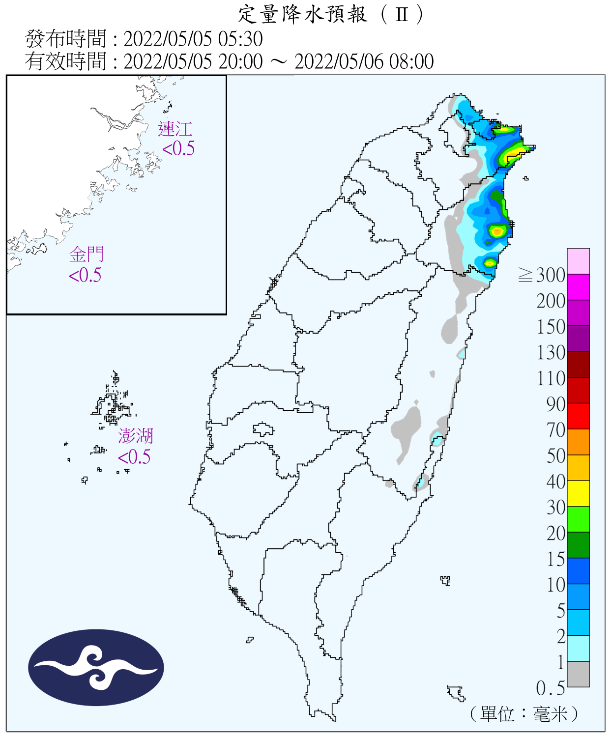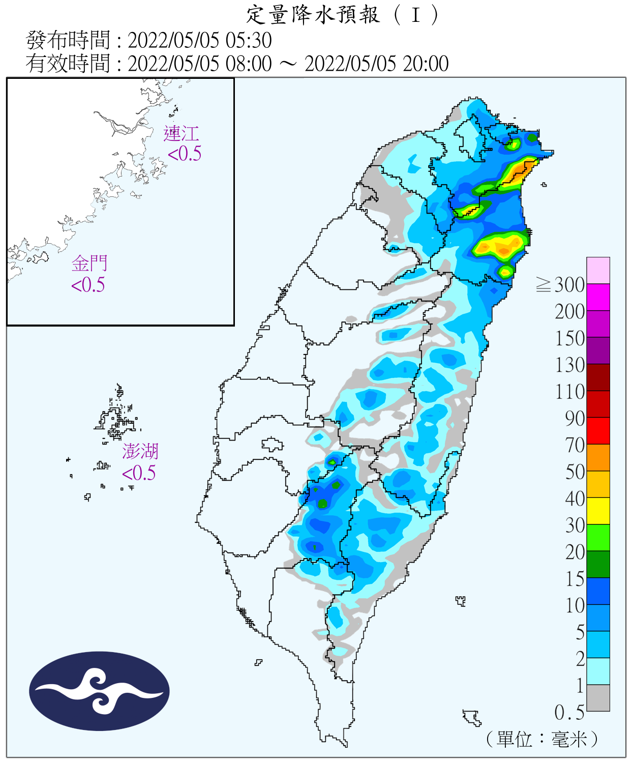 今(5)日受到偏東風影響,氣象局針對基隆北海岸及宜蘭地區發布大雨特報。此外,今日西半部地區天氣多雲到晴,陽光露臉的機會明顯增加,迎風面的東半部地區則,仍持續有短暫陣雨。然而,從周末開始台灣附近可能又會慢慢發展出新的雲雨帶,各地降雨機會增加。