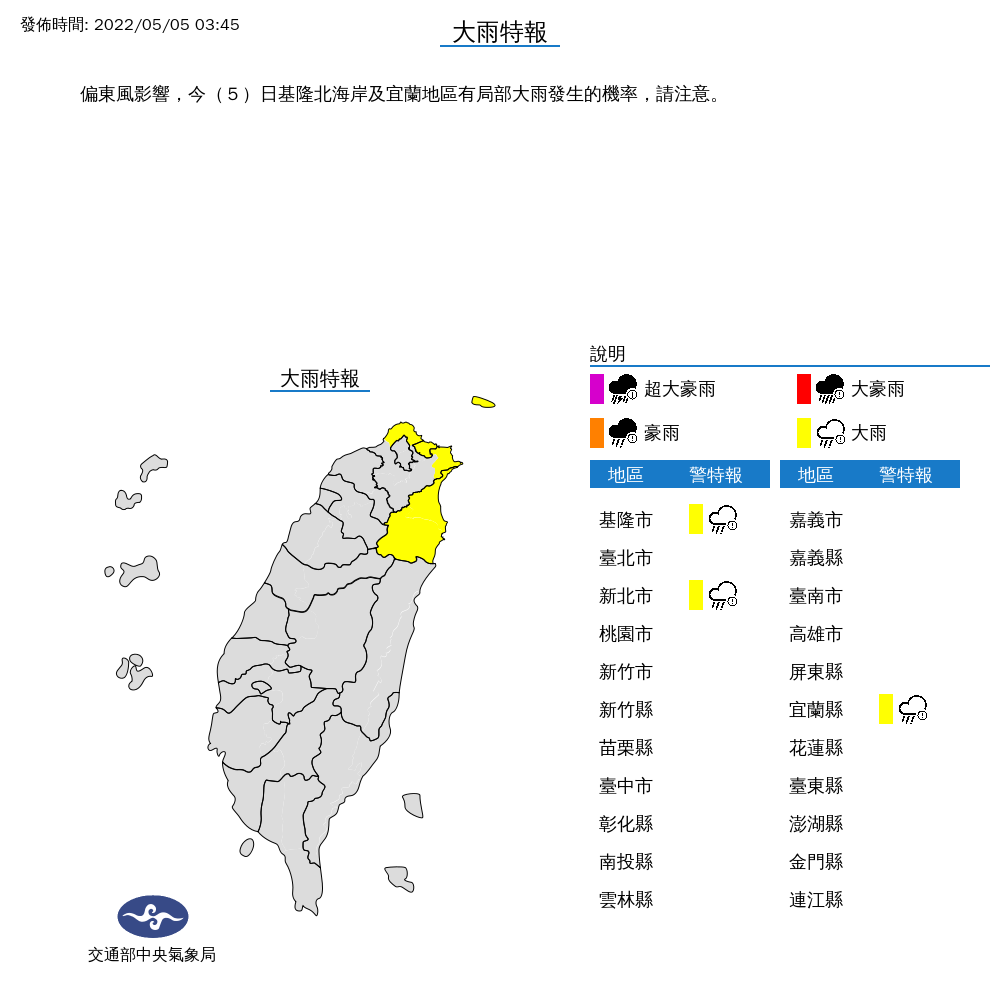 ▼今日氣象局針對基隆北海岸及宜蘭地區發布大雨特報。(圖/翻攝自氣象局)