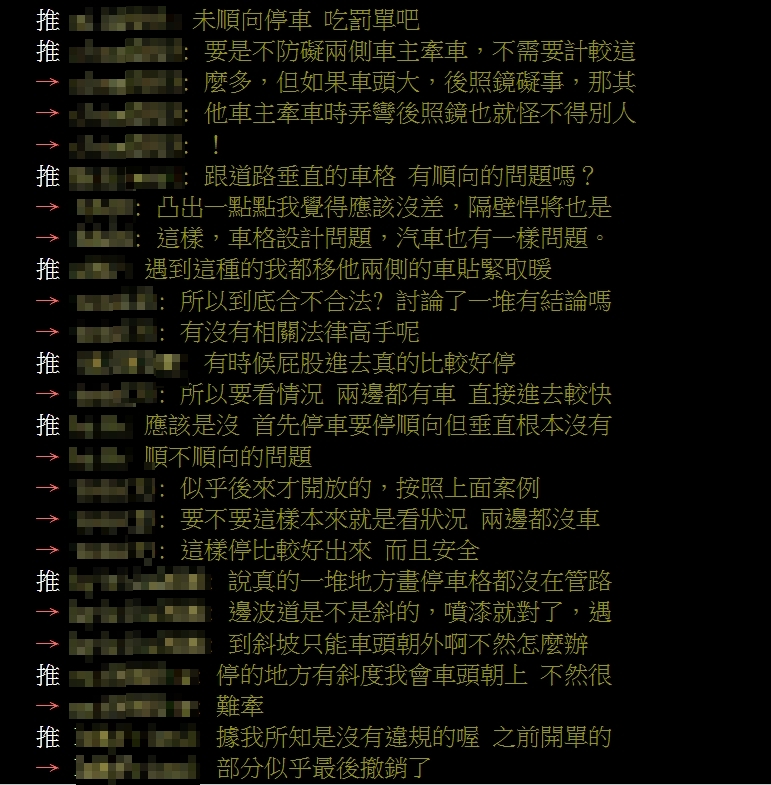 好奇心作祟的他,因此在PTT上發文尋求網友們解答。貼文曝光後,底下網友各持不同意見,有網友表示「看各縣市規定」、「未順向停車,吃罰單吧」、「我記得以前有人被開過不依照道路方向停車,之後修法修正了」、「不合法的說法是有根據那條法規?」、「道路交通安全規則第112條第3款」、「印象中之前新聞報導過,是看各地方政府規定?」