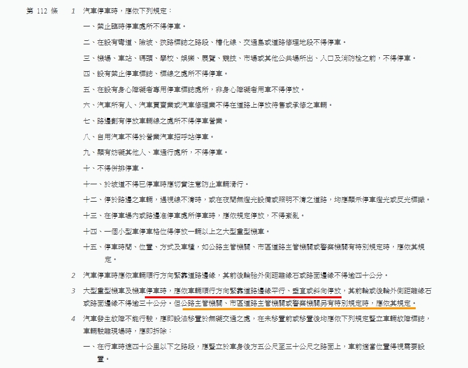 根據「道路交通安全規則」第112條第3項規定,「大型重型機車及機車停車時,應依車輛順行方向緊靠道路邊緣平行、垂直或斜向停放,其前輪或後輪外側距離緣石或路面邊緣不得逾三十公分。但公路主管機關、市區道路主管機關或警察機關另有特別規定時,應依其規定。」