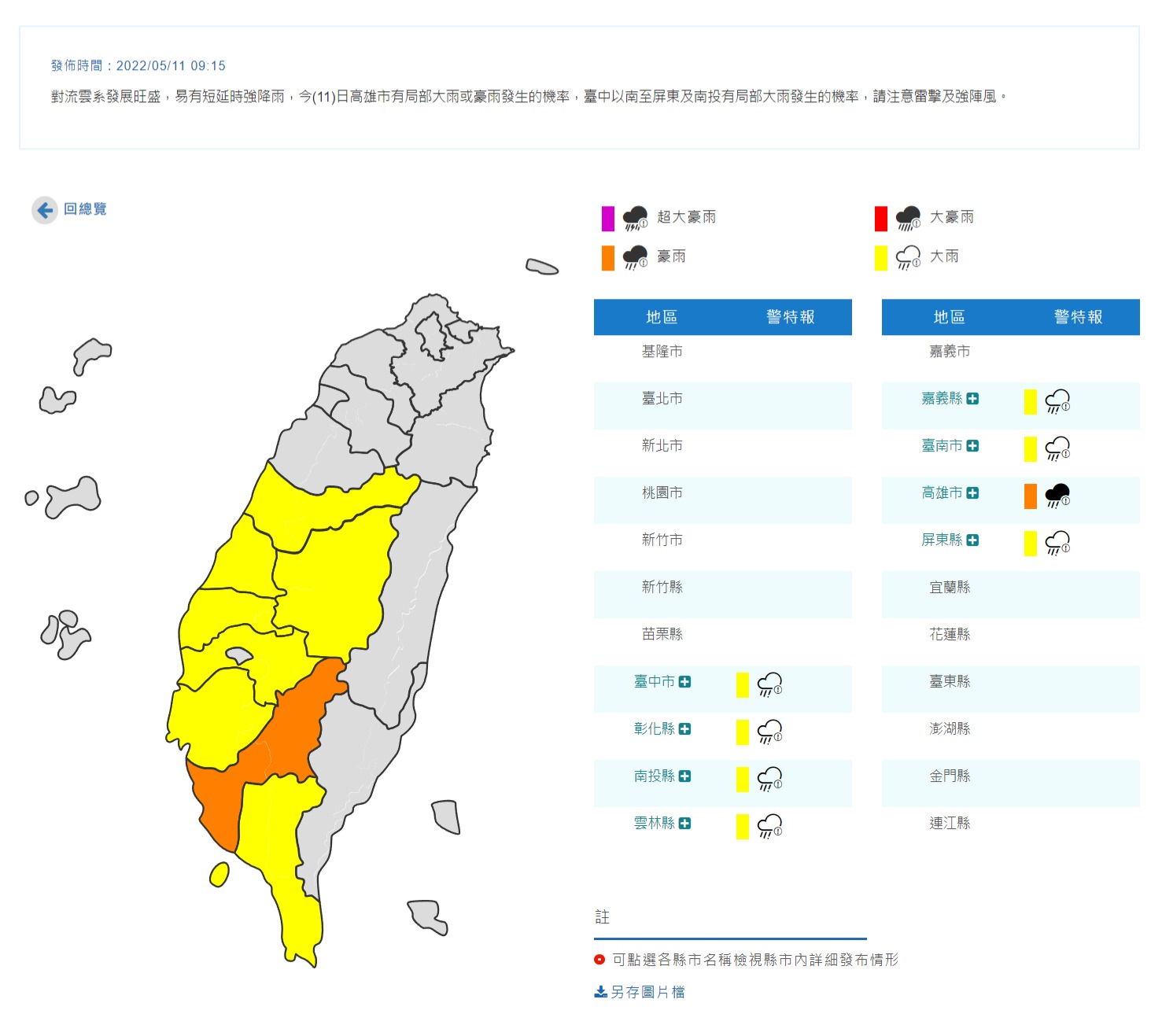 今日氣象局在9點15分發布8縣市豪、大雨特報,其中台中市、彰化縣、南投縣、雲林縣、嘉義縣、台南市、屏東縣為大雨特報,而高雄市則要注意豪雨,此外,氣象局也針對「台中市、彰化縣、高雄市、屏東縣、台東縣」在上午9點16分、22分發布大雷雨即時訊息,呼籲民眾步行與開車請注意安全。能見度低,請注意行車安全、減速慢行。