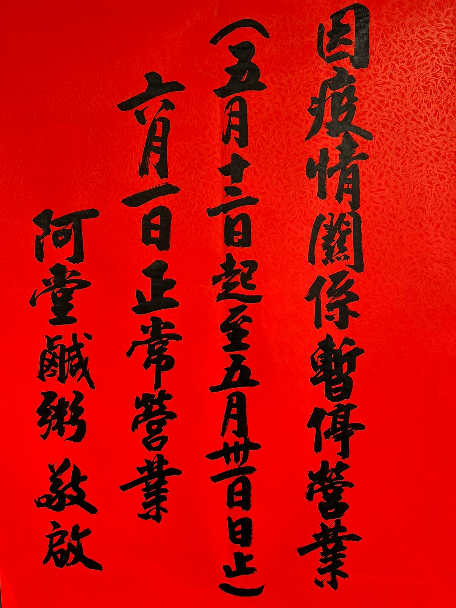阿堂鹹粥11日在臉書粉絲團發出公告,老闆以毛筆字寫下,「因疫情關係暫停營業」,將從5月12日一路休到5月31日,等到6月1日才會重新復業。阿堂鹹粥去年底就因為魚肚、魚皮粥價格從180元調漲至200元引發網友負評,不過生意未受影響,如今因疫情衝擊,最後也只好暫停營業應對。